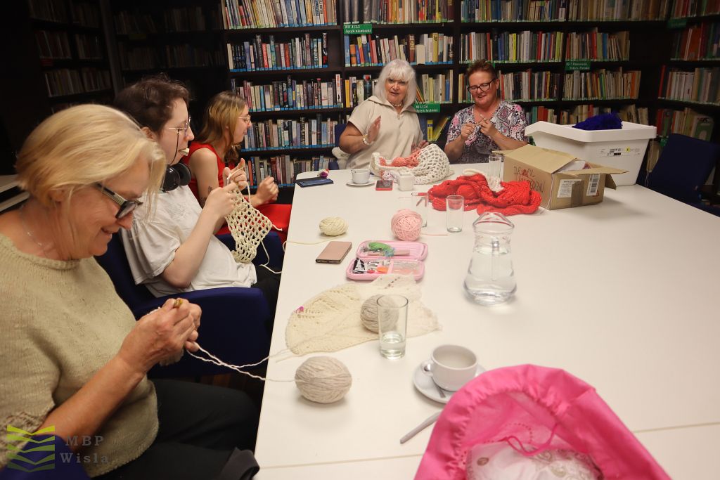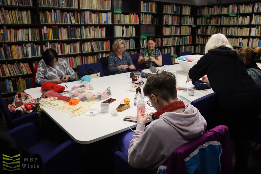 Wisienką na torcie było spotkanie autorskie z Aleksandrą Rak. Pisarka pochodzi z Wyr. W swoich powieściach porusza głównie tematy rodzinne, które opisuje w sposób delikatny i czuły. Potrafi zaczarować czytelnika i wprowadzić go w świat, z którego nie chce wychodzić. Książki są pięknie wydane przez Wydawnictwo Flow. Po spotkaniu był czas na rozmowy, autografy, kawę, ciasto… Międzypokoleniowe dzierganie to ostatnia atrakcja Tygodnia Bibliotek. Panie w sympatycznej atmosferze przy pomocy drutów i szydełek z kolorowej włóczki wykonywały małe cudeńka. Podziwiamy ich talenty i zapał do pracy twórczej. Oprócz wyżej opisanych spotkań odbył się spektakl „ W tę zieleń” oraz spotkanie podróżnicze „ Szkocja-stan umysłu” , które zostało nakreślone osobno. XXII Ogólnopolski Tydzień Bibliotek uważamy za zamknięty. Do zobaczenia za rok!